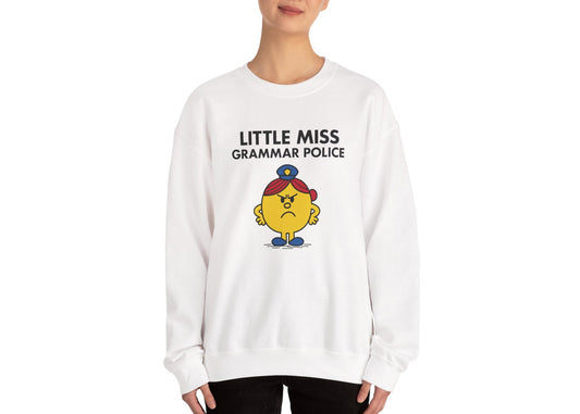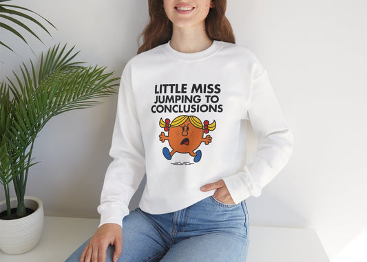 • Front view of a white sweatshirt featuring the Little Miss Can’t Be Wrong cartoon graphic. Part of the Little Miss Meme Character Collection. A Vivid Divergence Sensory Friendly Sweater Jumper.