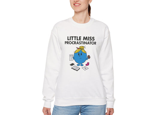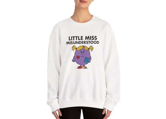 • Front view of a white sweatshirt featuring the Little Miss Delulu cartoon graphic. Part of the Little Miss Meme Character Collection. A Vivid Divergence Sensory Friendly Sweater Jumper.