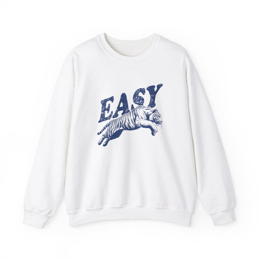 • Front view of a white sweatshirt featuring the word "EASY" in bold RED letters with a graphic of a leaping tiger underneath. Part of the Vivid Divergence Sensory Friendly Unisex Sweater Jumper Range.