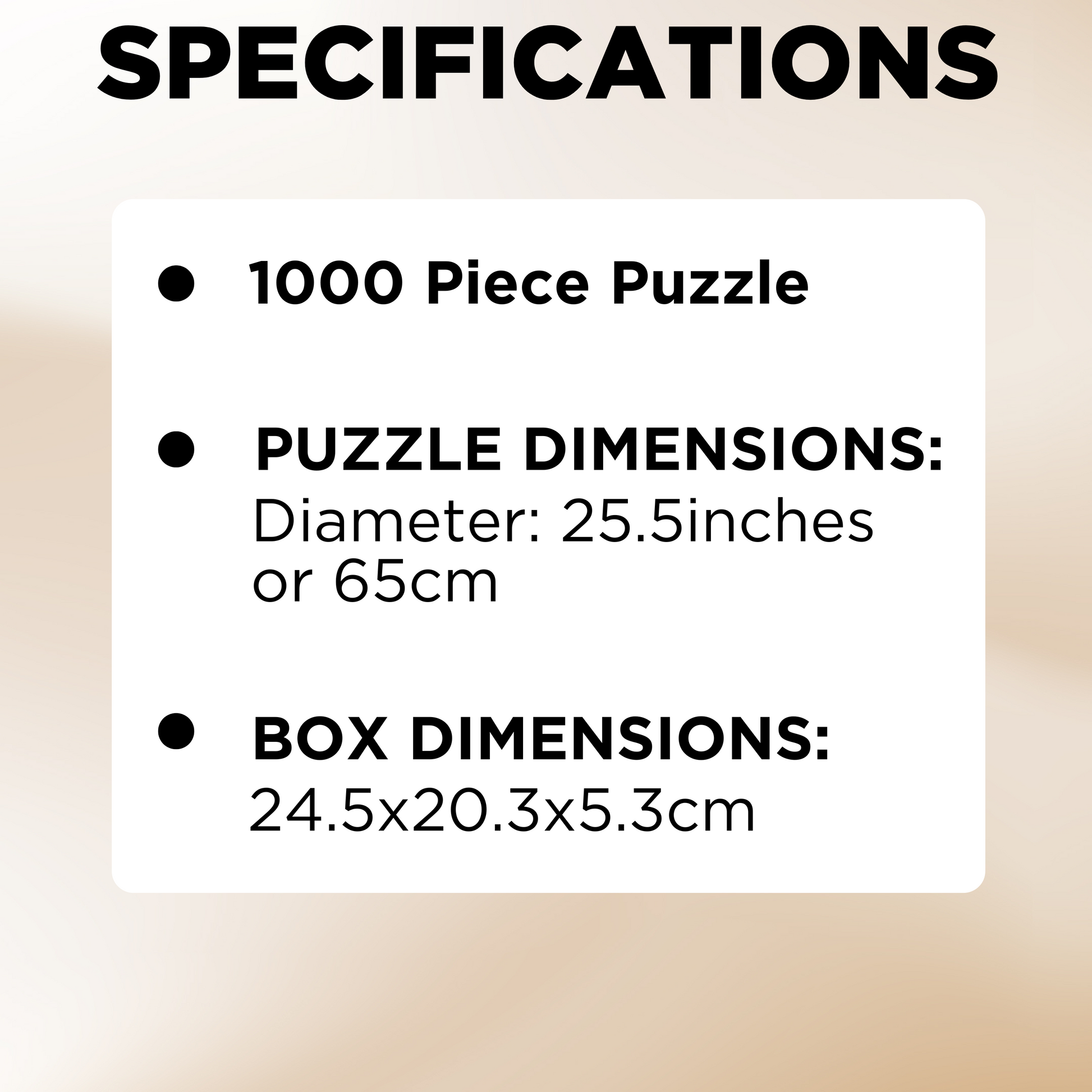 • Puzzle diameter: 25.5 inches (64.77 cm), making it the perfect size to display as wall art once completed.